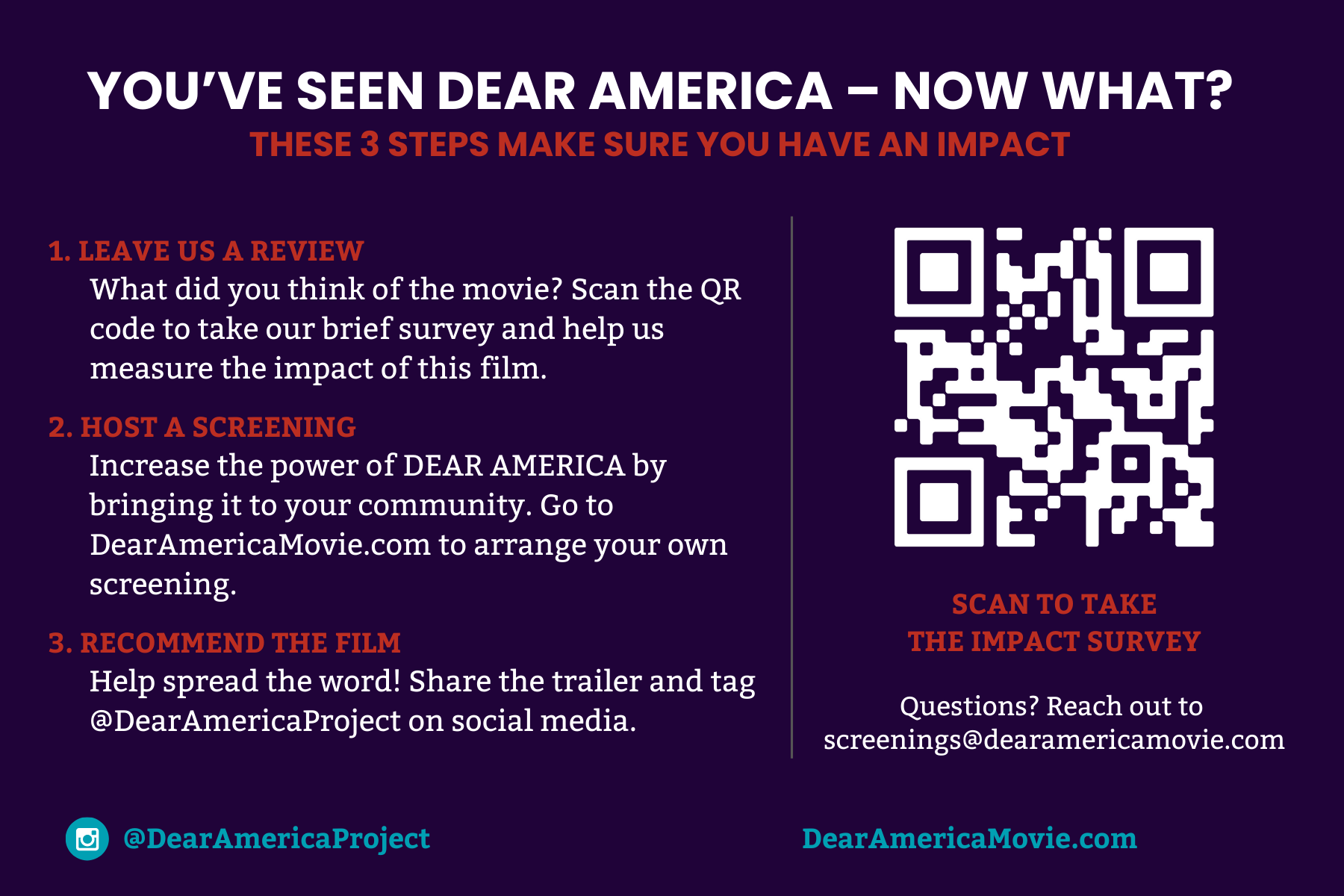 Help us measure the impact of DEAR AMERICA’s story. Print and share these impact survey postcards which provide viewers at your screening an opportunity to leave a review and get involved in the centuries long fight for democracy and equality.